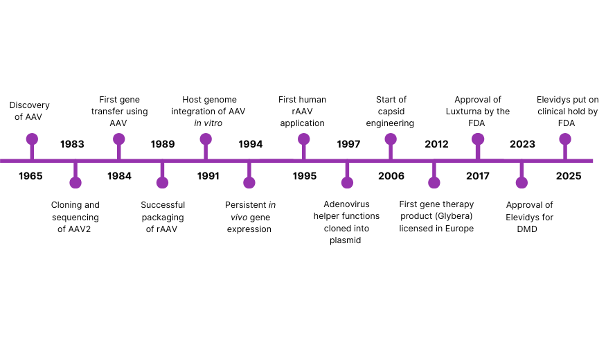 Figure 1: Major Historical milestones in AAV research and development from the discovery of AAV in 1965 up until 2025